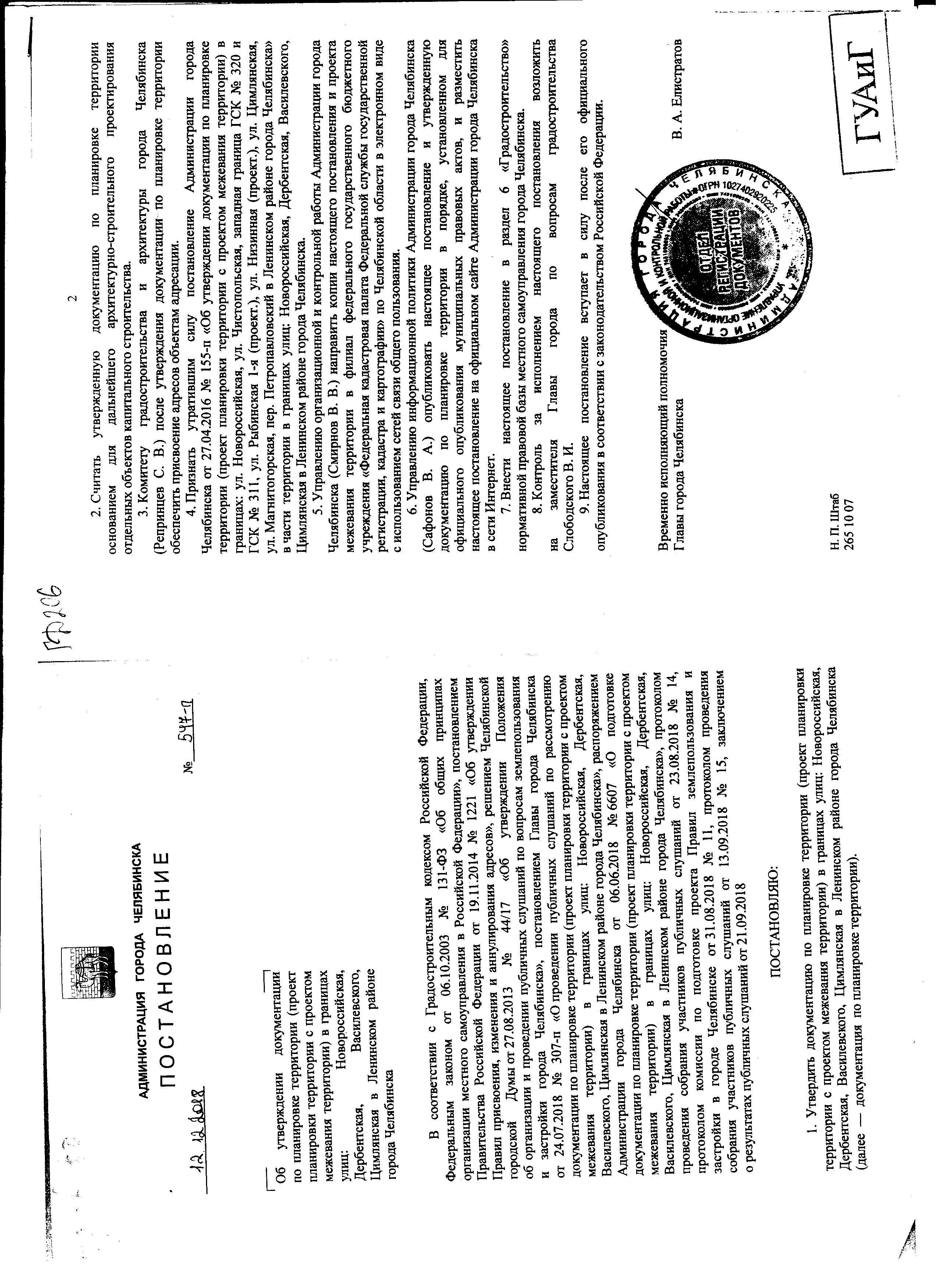 Постановление Главы города № 547-П от 12.12.2018 "Об утверждении документации по планировке территории (проект планировки территории с проектом межевания территории) в границах улиц: Новороссийская, Дербентская, Василевского, Цимлянского в Ленинском районе города Челябинска"